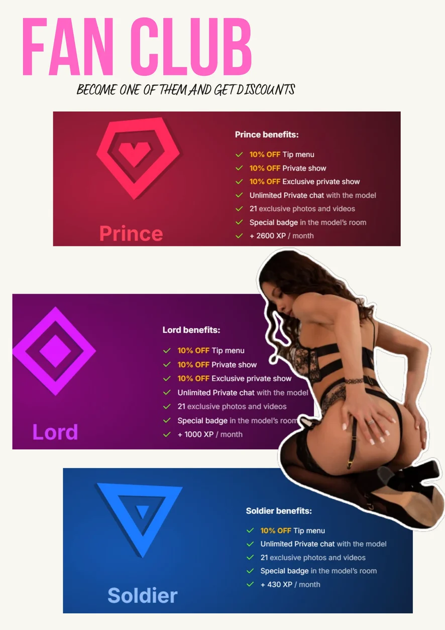 Kancelář, Jóga, Podpatky, Nylon, Špinavá mluva, Dominy, Pokyny k masturbaci, Roleplay, Ponižování, Footfetish, Ahegao, Hodnocení péra, Erotický tanec, Olejová show, Plácání po zadku, Krátká sukně, Orgasmus, Masáž, Exhibicionismus, Sprcha, Velbloudí palec, Na koníčka